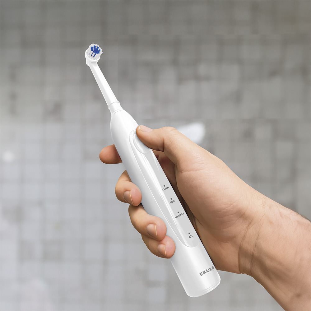 Sähköhammasharjan pieni pyöreä harjaspää tavoittaa koko hampaan. Harjaspää on muotoiltu saavuttamaan myös vaikeapääsyiset alueet hampaiden väleissä ja poistaa tehokkaasti plakkia. EKULF Oscillating PowerBrush tarjoaa useita puhdistustiloja sopimaan yksilöllisiin tarpeisiisi. Valitse CLEAN, SOFT ja MASSAGE -tilojen välillä saadaksesi sopivan ja hellävaraisen puhdistuksen. 8800 harjaliikkeeseen minuutissa yltävä EKULF Oscillating PowerBrush mahdollistaa voimakkaan puhdistuksen terveempien hampaiden saavuttamiseksi.