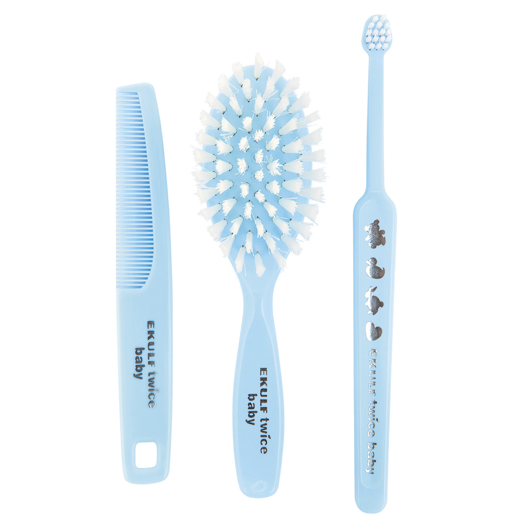 Settiin sisältyy EKULF twice Vauva -hammasharja, hiusharja ja kampa. Hammasharjan pehmeät, kärjistään pyöristetyt harjakset tekevät harjauksesta toimivaa ja hellävaraista. Lisäksi sen pitkä, ergonominen varsi tekee kaikkien kulmien ja takimmaisten hampaiden saavuttamisesta helpompaa samalla kun pieni ja kompakti harjaspää vähentää oksennusrefleksejä. Hiusharjan polyesterikuidusta valmistettujen harjasten kärjet on pyöristetty, mikä tekee harjaamisesta pehmeää ja hellävaraista lapsesi herkälle hiuspohjalle. Pienen ja joustavan kamman kapeiden hampaiden kärjet on pyöristetty. Hiusharjaa ja kampaa voi käyttää myös tali-ihottuman poistoon.