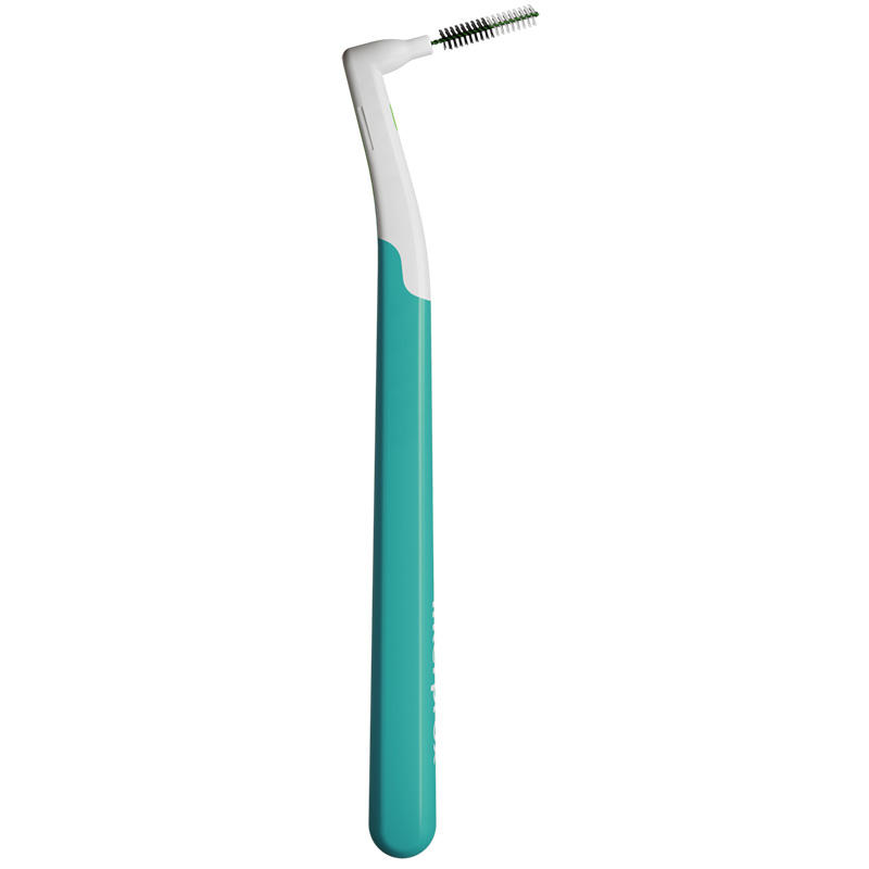 Interprox vinkel plus -hammasväliharjan taivutettu pää helpottaa hampaiden taka- ja ulkopuolen pudistamista. Jokaisessa harjassa on lyhyt, hyvän hallinnan mahdollistava 2-komponenttivarsi sekä harjaa suojaava muoviholkki. Hammasväliharjaa ei pidä koskaan pakottaa hampaiden väliin, vaan sen on liu’uttava sinne helposti.